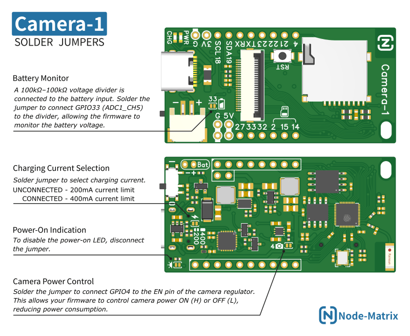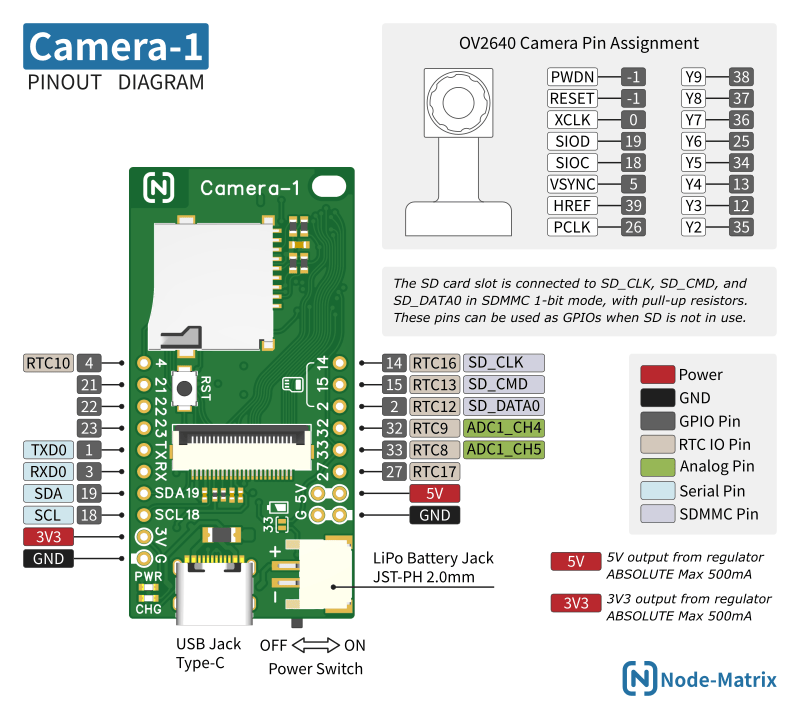 Camera-1 exposes as many usable pins as possible, including 10 GPIO pins (3 shared with the SD card slot), UART, and I2C interfaces. These GPIOs can be used to control additional peripherals such as servos, motors, and solenoids. By connecting a PCA9685 module via I2C, more PWM outputs can be obtained. The onboard DC-DC converter provides 5V and 3.3V power outputs (up to 500mA each), supplying power for external modules. Camera-1 integrates essential features such as a USB-to-serial interface, SD card slot, and charging management. It also supports battery voltage detection and camera power control through jumper configuration.