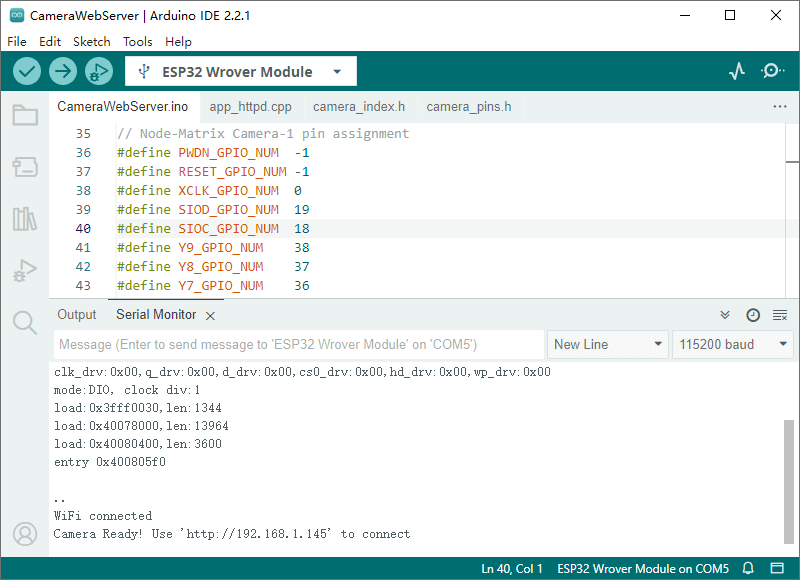 CameraWebServer.inofile. In theSelect camera modesection of the code, uncomment the definition corresponding to your board to specify the pin configurations predefined incamera_pins.h.Alternatively, you can manually define the pins. Using the Camera-1 board as an example, the custom pins are: