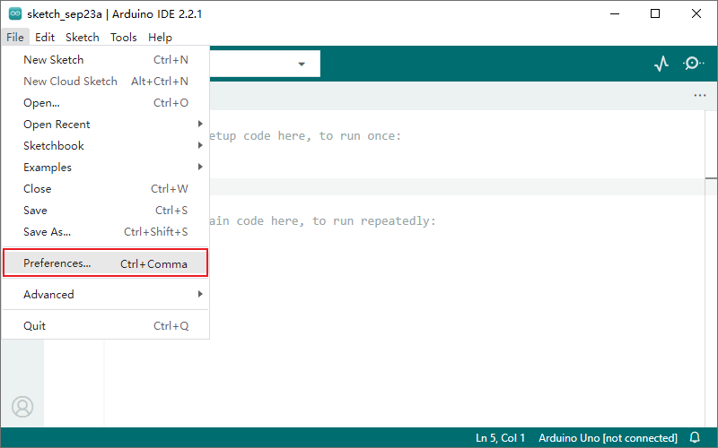 Launch Arduino IDE 2.0 and navigate to File > Preferences….