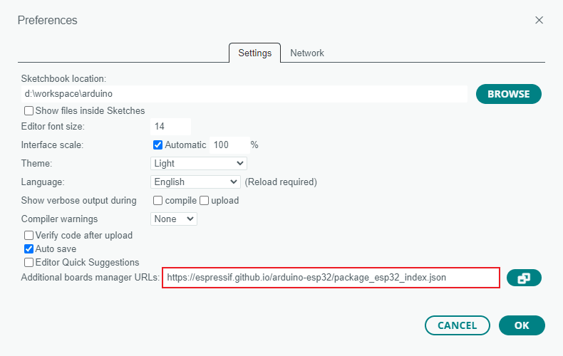 Copy and paste the following URL into the Additional boards manager URLs field (separate multiple URLs with commas).