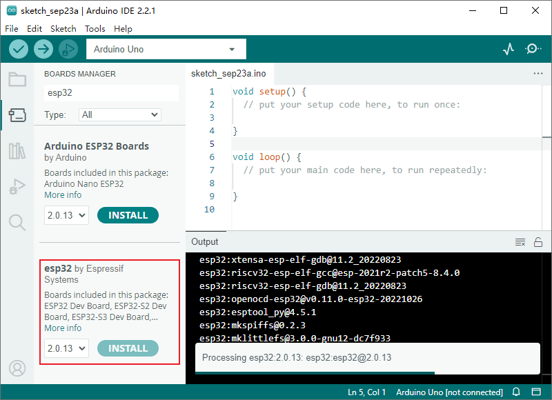 Click the board manager icon on the left sidebar, or select the menu Tools > Board > Boards Manager…, search for "esp32", locate