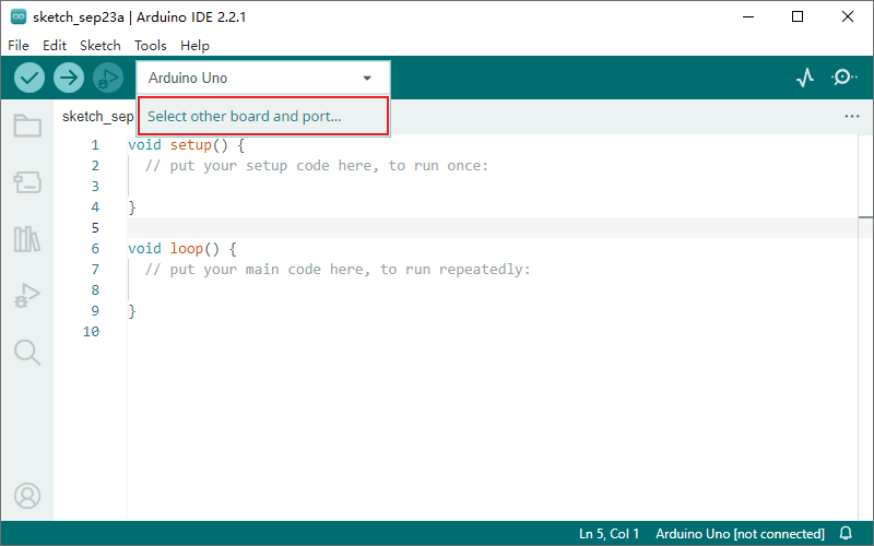 Click the board selection dropdown in the top toolbar and choose Select other board and port… to open the board selection dialog.