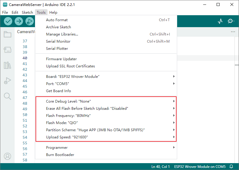Enter your WiFi credentialssection ofCameraWebServer.ino, update thessidandpasswordwith your network settings.cpp// =========================== // Enter your WiFi credentials // =========================== const char* ssid = "my_wifi_ssid"; const char* password = "my_wifi_password";Configure the parameters in the Tools menu based on your board’s hardware configuration. For example, the parameters for Camera-1 are as follows:
