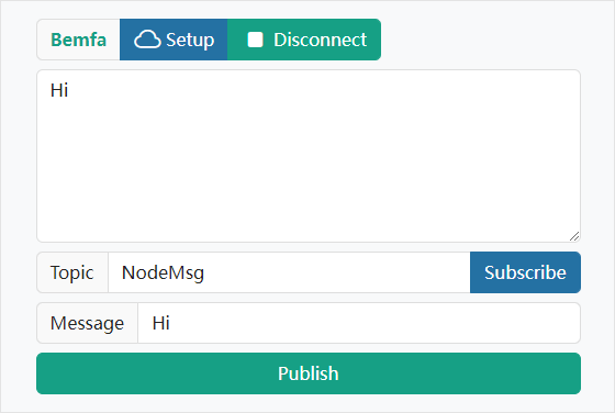Node-App encapsulates commonly used HTTP, WebSocket, and MQTT client functionalities into easy-to-use blocks, making it simple to achieve hardware interaction. For example, an app that sends and receives MQTT messages through Bemfa Cloud: