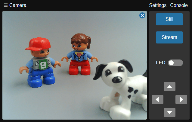 Set the camera parameters on the Camera page, see Camera Settings for details. Click the Still button to view real-time photos, or the Stream button to start the video stream. The firmware supports SVGA 800x600 resolution with a 25FPS video transmission frame rate. If you've configured LED port or pan-tilt servos in the system settings, you can control the LED switch or pan-tilt actions from the panel. To maximize the display area, click the ☰ Camera button in the navigation bar to collapse the parameter panel.