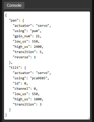 The Console configuration defines the connection between the video console page and the physical servos/DC motors, based on the combination of the above actuators. The JSON template for actuator configuration in the Console is as follows: