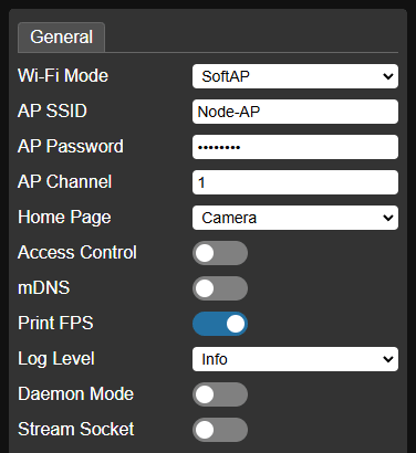 SoftAP(provides 2.4GHz access point service) orSTA(accesses 2.4GHz network as a client). After selecting a mode, the panel will display the corresponding configuration options for setting the SoftAP’s broadcast SSID and password, or the STA's access SSID and password. In SoftAP mode, you can also specify the Wi-Fi channel (1~13). If the network environment has high interference, try switching channels.In SoftAP mode, the Node-Camera's IP address is fixed to