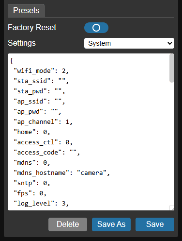 System) and any saved configurations. Selecting a configuration displays its JSON content in the text box below. You can directly edit and save the configuration in the text box.Delete - Delete button. Deletes the selected configuration. The system configuration (