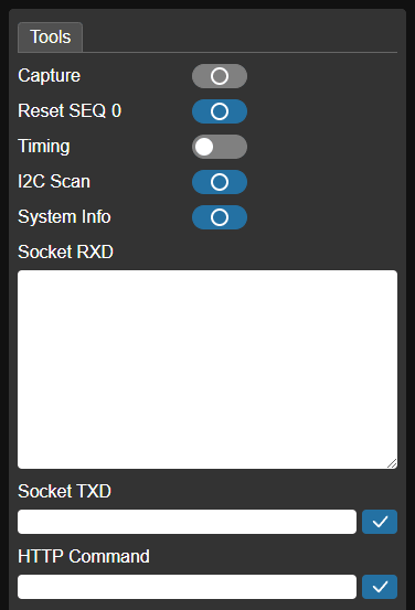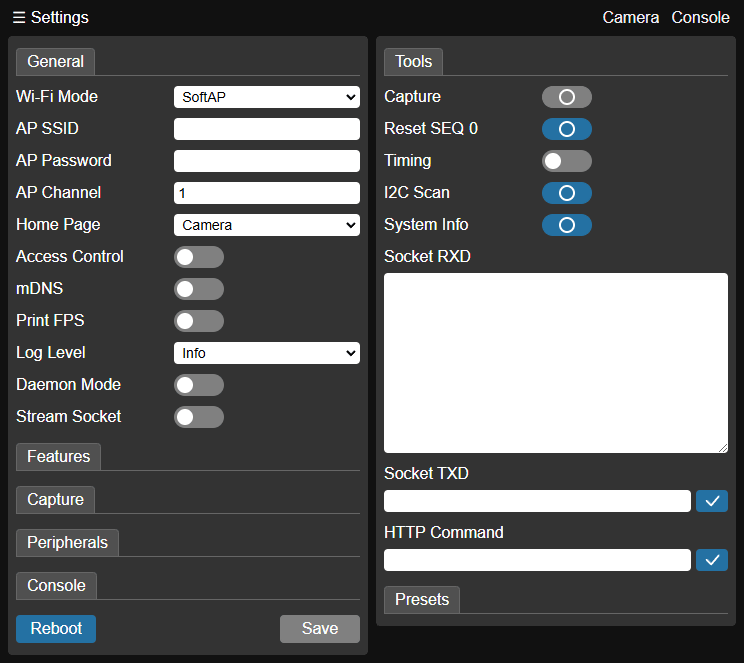 The Tools tab provides functional tests for capturing images, Serial-WebSocket bridge, network commands, and auxiliary functions such as I2C scanning and viewing system information. When UART Socket is enabled, the page will automatically establish a serial WebSocket connection.